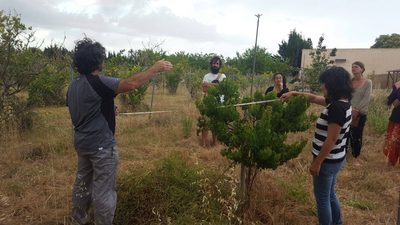 Julio explica como debido al uso de maquinaria agrícola pesada se han compactado muchos suelos de Mallorca, de manera que entre otras cosas, no absorben ni retienen la poca lluvia que cae, llegando incluso a hacer inviable el crecimiento de especies que había antes, como el cerezo…De nuevo la gestión del suelo se hace fundamental en estos casos. Usar rábano mallorquín, zanahoria silvestre, vétiver o incluso daikon para descompactar el suelo, y así poder poco a poco regenerarlo. Vamos repasando que especies se pueden ir poniendo para una buena gestión de suelo que ayude al bosque sucesional. Otra práctica relacionada con la captación de lluvia son los Jardines de Lluvia, donde se recoge el agua de techos y caminos para dirigirlos donde sean necesarios. Es tan importante sacar el máximo partido a esta bendita agua…