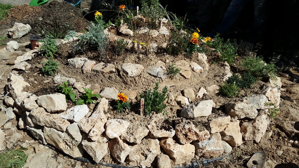 El primer rendimiento que hemos obtenido del dia de hoy es que desde ahora podemos contar con una bonita espiral de aromáticas ¡en uno de los sitios demostrativos de PermaMed!
